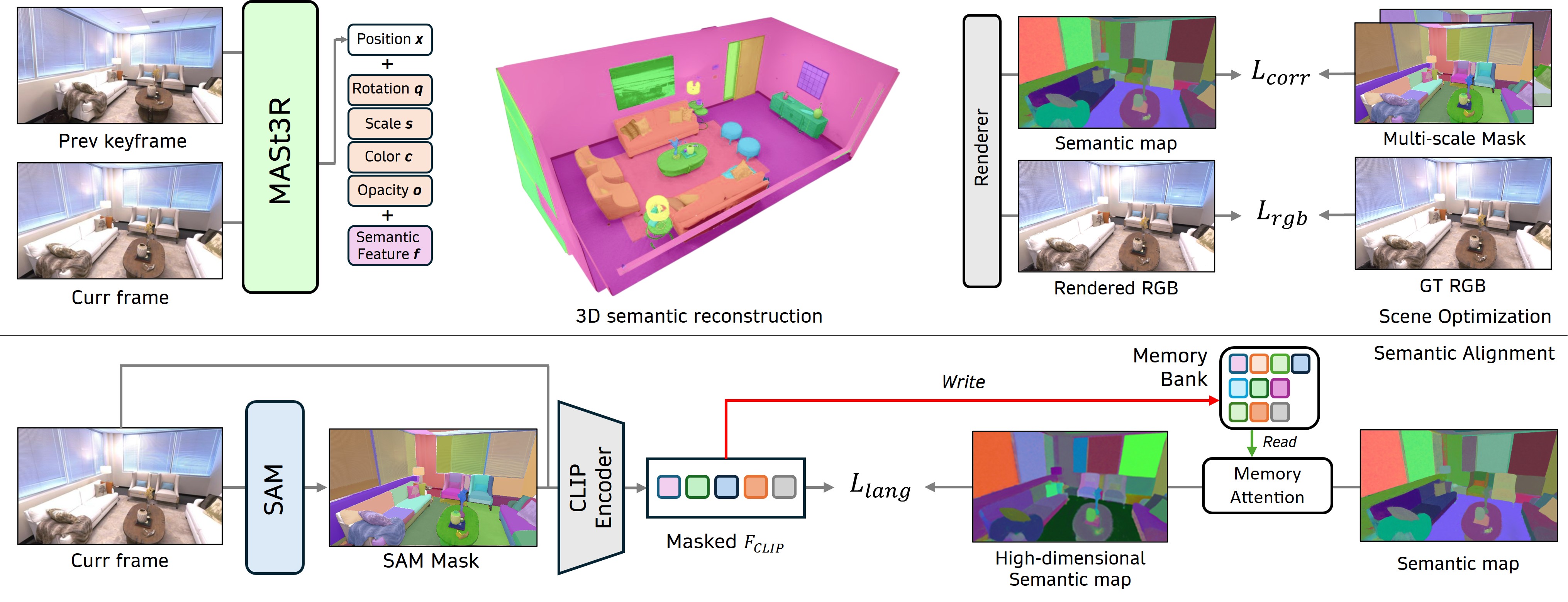 Top: Given the previous keyframe and the current frame, MASt3R estimates a point map. The 3D Gaussian scene is initialized by assigning each point with Gaussian attributes and a learnable semantic feature vector. Differentiable rendering produces an RGB image and a semantic feature map, supervised by the ground-truth RGB image and multi-scale SAM masks, respectively. Bottom: When the current frame becomes a new keyframe, SAM predicts instance masks and masked CLIP features are extracted from the RGB image. These features update the memory bank online and provide targets for the language-guided loss. Memory attention then retrieves high-dimensional semantics to refine the Gaussian semantic map.